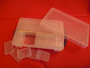 In dieser Plastikkiste können 40 kleine Plastikschachteln (B-10) übersichtlich eingeordnet werden. In der Mitte ist ein Steg aus Holz, damit die Schachteln auch bei halber Füllmenge nicht durcheinander fallen. Das Material ist sehr stabil und hochwertig.
