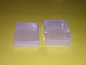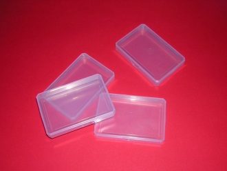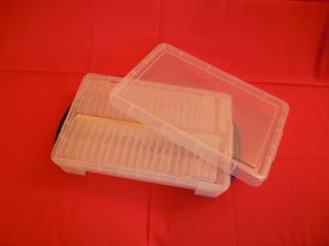 Diese Plastikschachteln gibt es auch etwas größer. Das Format ist wie bei den Schachteln B-10, sie sind jedoch ca. 1 cm höher. Diese Schachteln bieten zum Beispiel auch Platz für Würfel und Spielsteine.